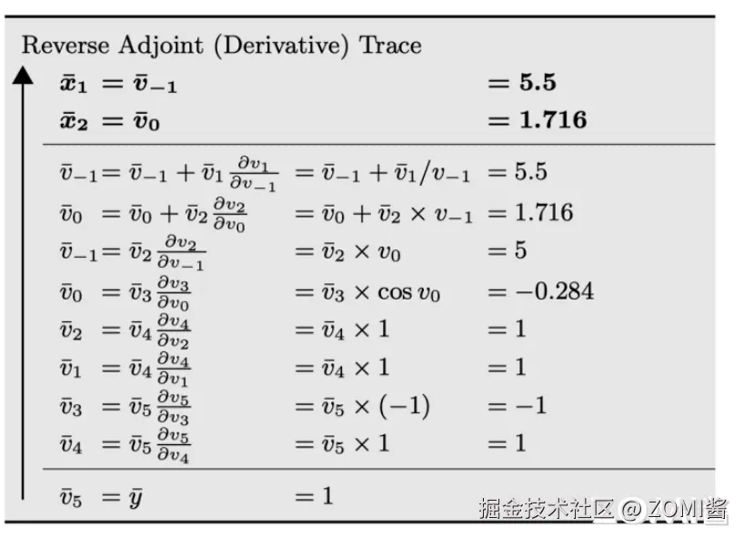 AI 框架将会自动分析上图中表示的计算图的计算过程,通过追踪计算图中的数据流,对其中的每个参数都进行精确地微分,获取相应的梯度,以便后续计算中使用这些梯度在神经网络的训练过程中进行参数更新,上文所示的计算图的自动微分示意图如下图所示。