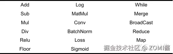AI 框架的 Operator 算子一般由最基本的代数算子组成,可以根据神经网络模型的需求组成复杂的算子,常见的 Operator 算子如下表所示。