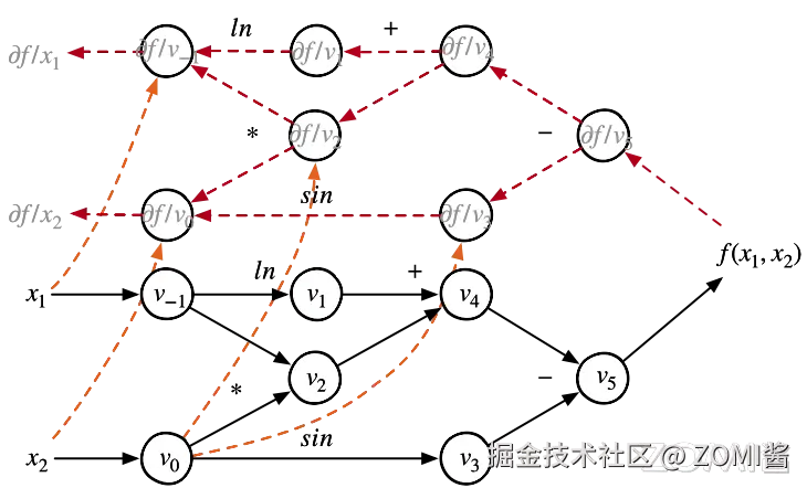 这是因为主流的 AI 框架将会自动分析神经网络的代码,不仅建立正向传播的计算图,也建立反向传播的计算图,如下图所示,实线部分为正向传播的计算图,虚线部分为 AI 框架自动建立的反向传播计算图。