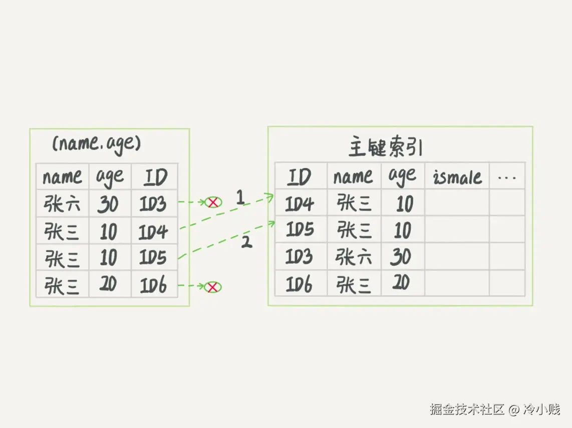 有索引下推的查询,在索引内部就判断了age是否=10,对于不符合条件的数据判断完直接跳过,所以在这个例子中只需要回表2次。
