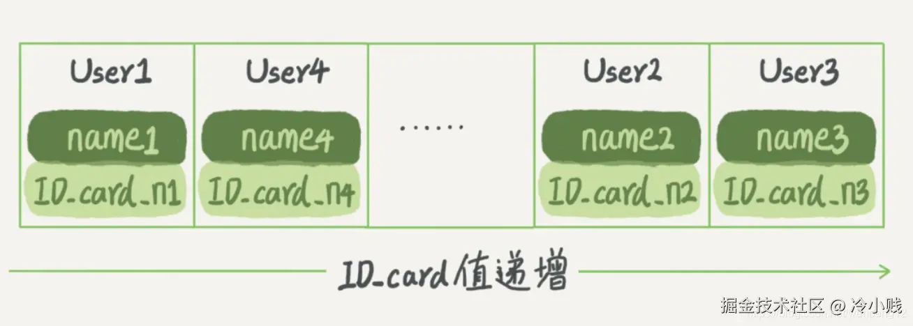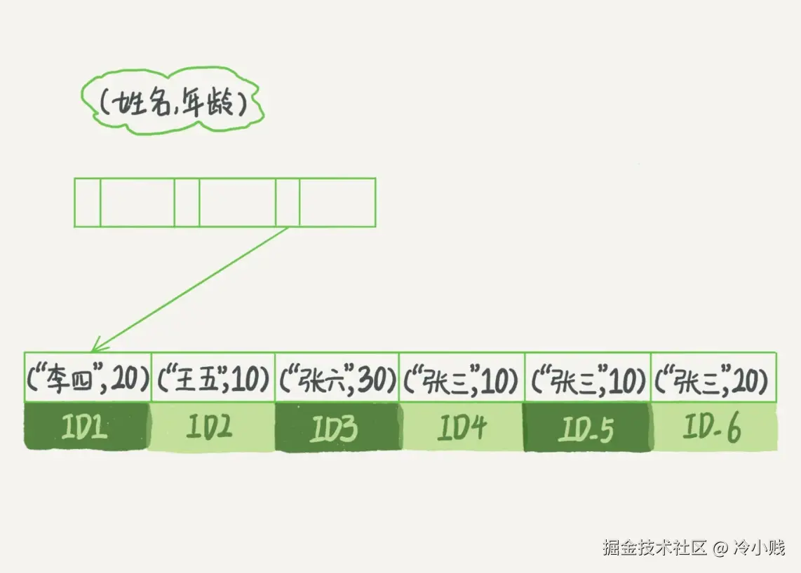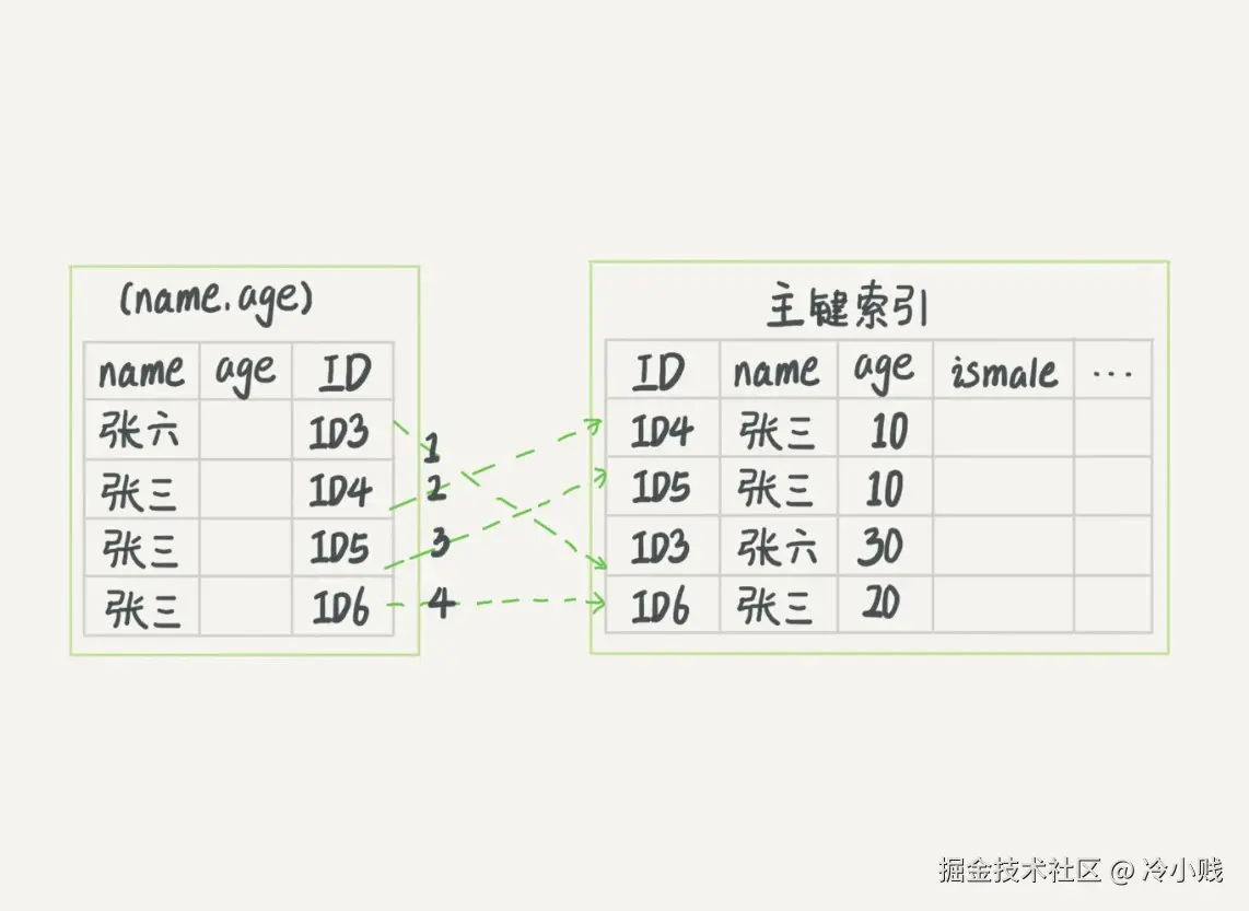 假如我们有一个组合索引(name,age),索引项是按照索引定义里面出现的字段顺序排序的: