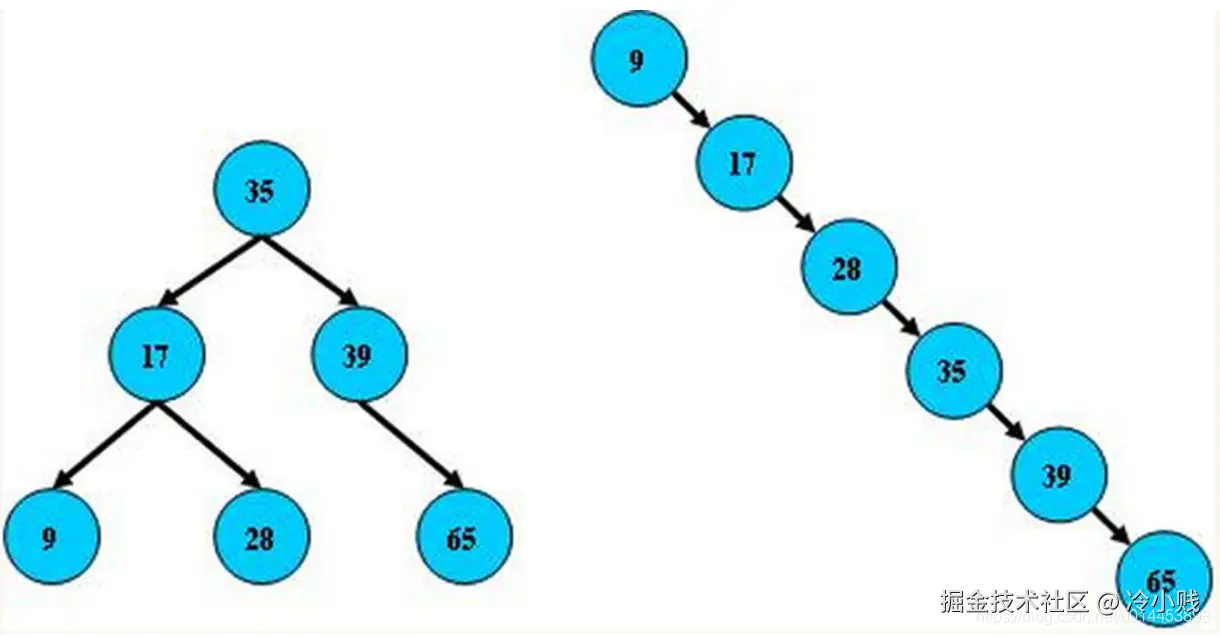 如果插入的节点的值的顺序是越来越小或者越来越大,那么B树就会退化成一条链表,那么其查询的时间复杂度就会降为O(n)。