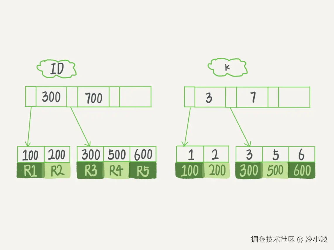 - 在 k 索引树上找到 k=3 的记录,得到 ID=300;