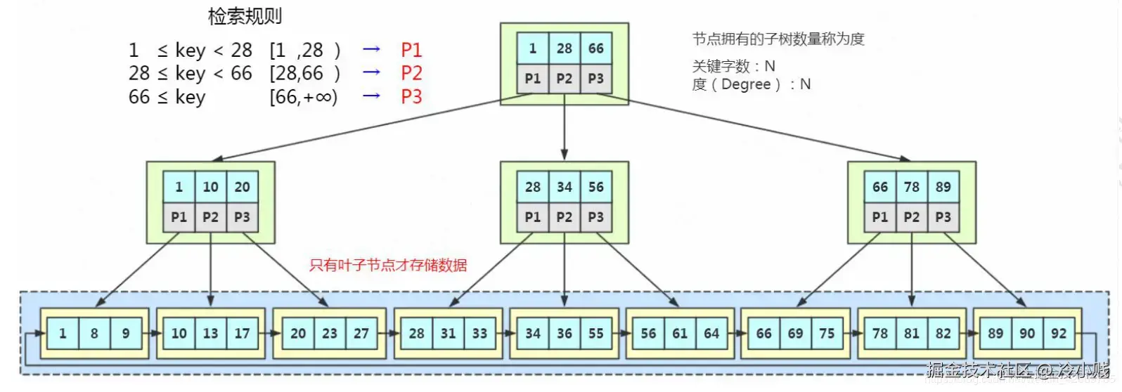- B+Tree 的每个叶子节点增加了一个指向相邻叶子节点的指针,它的最后一个数 据会指向下一个叶子节点的第一个数据,形成了一个有序链表的结构。