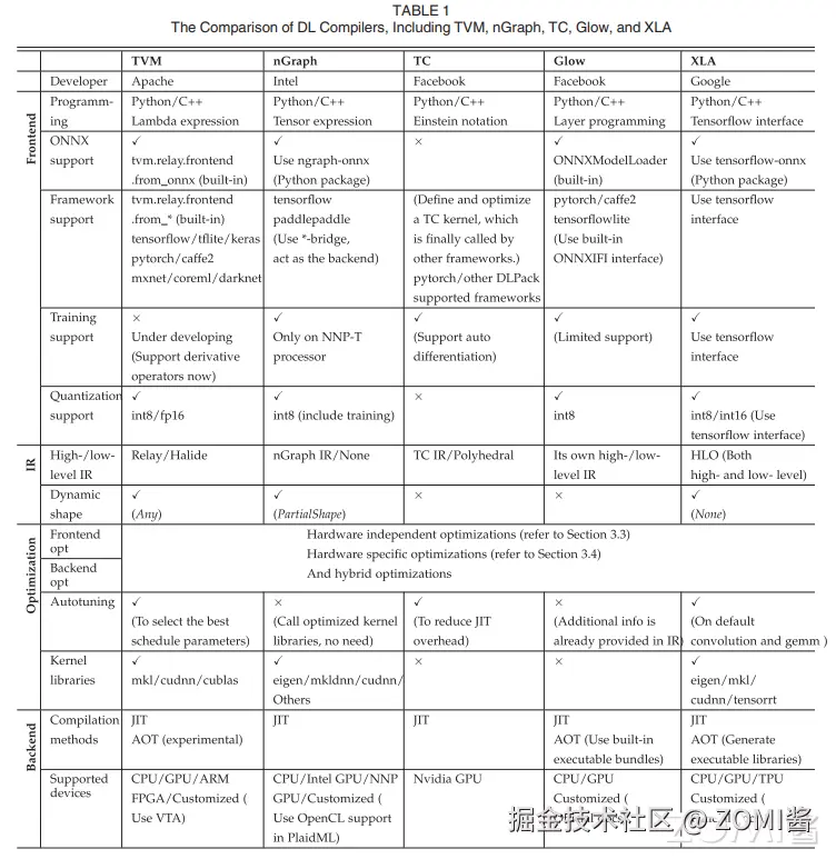 在 The Deep Learning Compiler: A Comprehensive Survey 文中做了一个调研,横向对比了TVM、nGraph、TC、Glow 和 XLA共五个热门 AI 编译器,如下图所示。