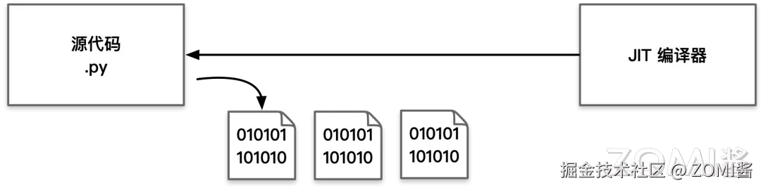 Python 在执行时一般有两种方法。第一种是生成字节码后通过 Python 虚拟机(Python Virtual Machine)交给硬件去执行,这也是最通用的一种执行方式。第二种是通过 Python 提供的 JIT(Just-In-Time)即时编译器进行编译生成一个机器码,然后直接交给硬件去执行。
