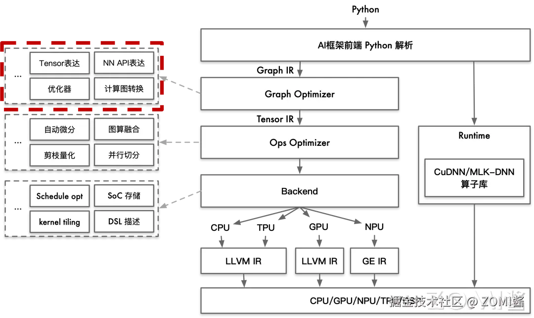在 AI 编译器整体架构图中其他的部分,如 AI 编译器的后端优化等,将在后续章节中进行介绍。