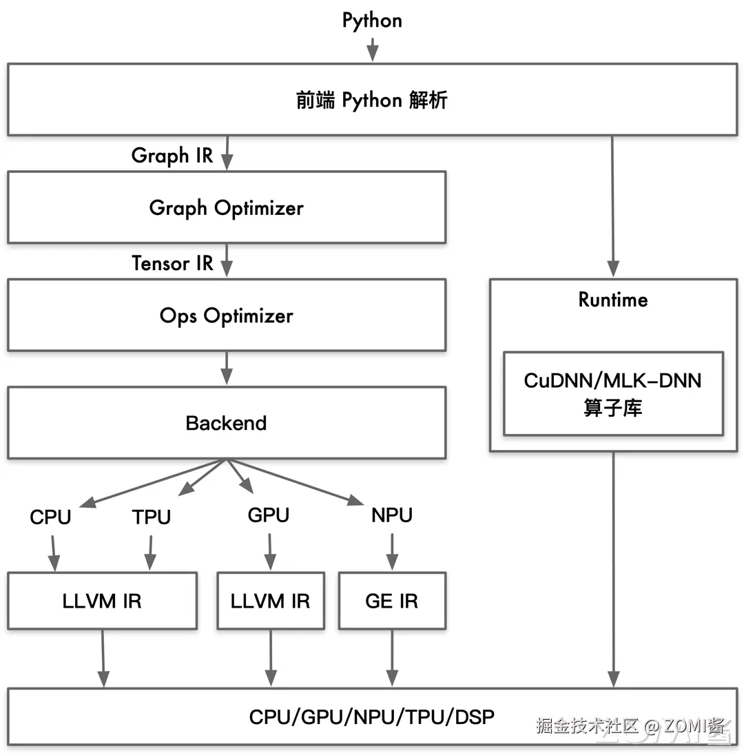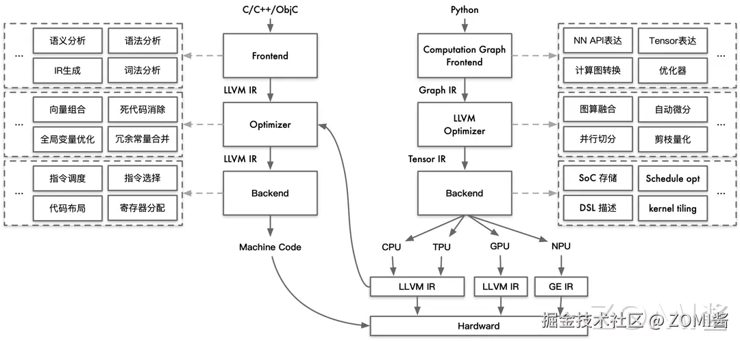软件栈结构类似:它们都分成前端、优化、后端三段式,通过 IR 解耦前端和后端使得可以进行模块化表示。