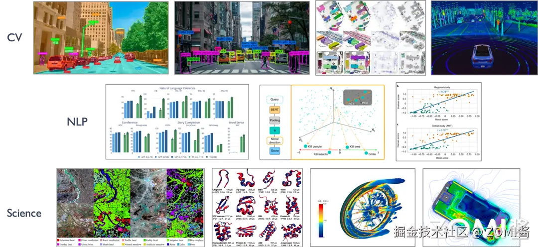 下图展示了 AI 算法横跨不同领域:自然语言处理,计算机视觉、科学智能等。这不仅展示了 AI 算法的复杂性也展示了 AI 算法的多样性。