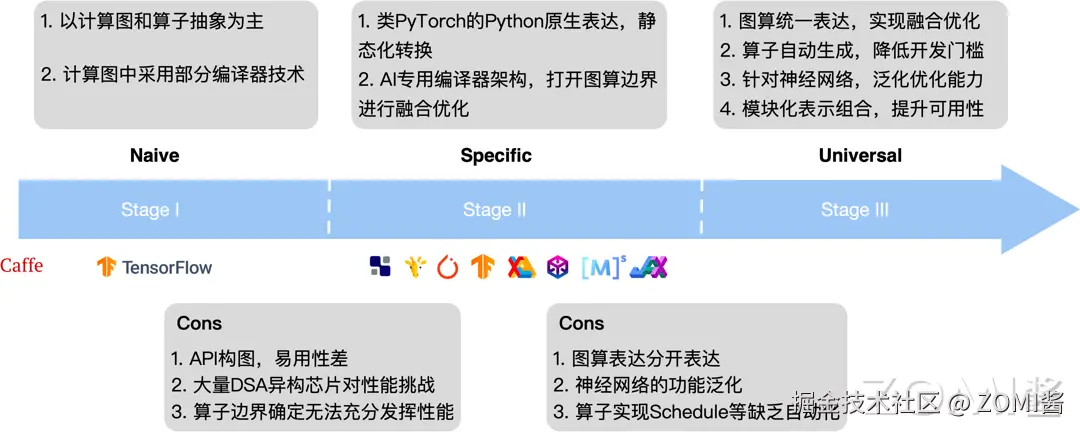 本文将通过介绍 AI 编译器的设计目标、定义、发展阶段等角度,详细探讨 AI 编译器的历史发展。如下图所示,AI 编译器的发展应该分为三个阶段:朴素 AI 编译器(阶段一)、专用 AI 编译器(阶段二)、通用 AI 编译器(阶段三),接下来我们将会主要按照这三个阶段的顺序详细介绍 AI 编译器的发展阶段。