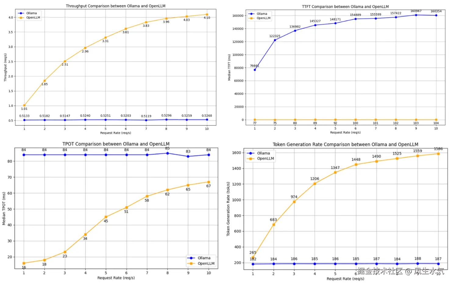 openllm和ollama单卡性能对比,数据来源:参考文档1