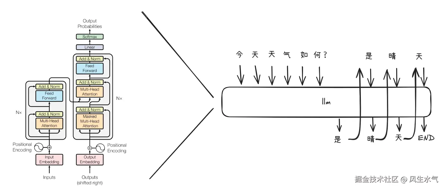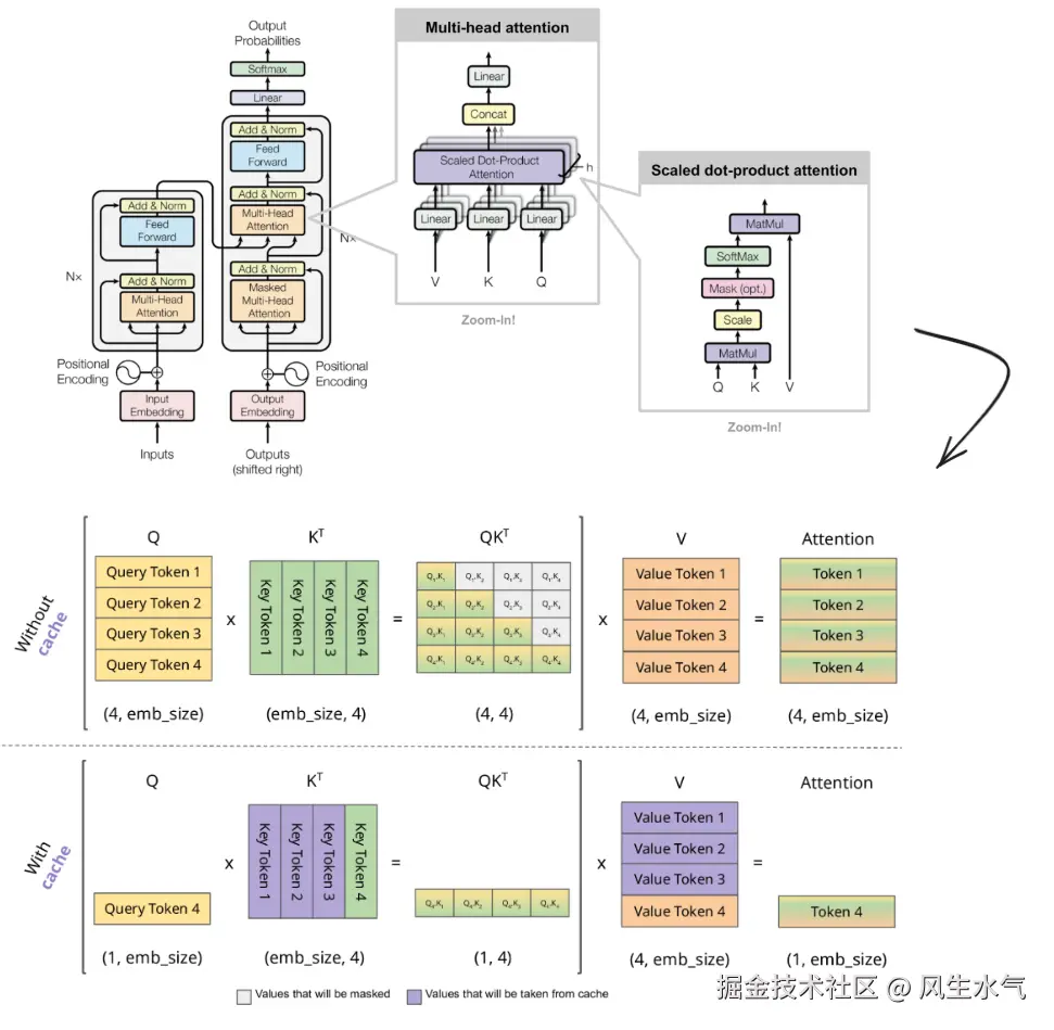 在这个架构之下, token是逐个生成的,当需要生成下一个token的时候,需要将之前生成的token信息作为上下文用于计算。很显然,这种处理方式效率很低,如果真的将其作为应用服务提供给用户使用,在大流量的场景下一定是满足不了上述挑战的。因此,通常需要对这个过程进行优化。