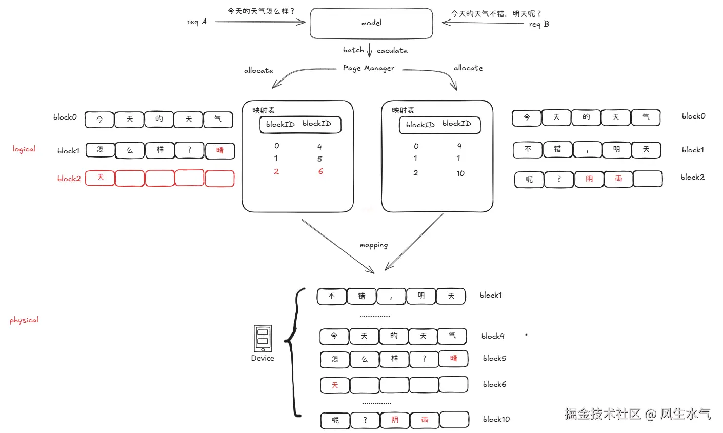 对于kv cache这部分动态数据的优化,PageAttention技术将内存划分为block进行管理,每个block大小固定。在前面的场景中,当请求到来时,会根据请求的大小分配固定数量的block(如图左侧的block0~1),当生成过程中长度超出分配长度时,会分配新的block用于存储新的内容(block2),从而实现动态内存分配,减少内存碎片。同时,对于批量处理中的不同请求,当请求处理完成后,会及时释放掉该请求的block,从而使这部分内存可以被其他请求利用。另外,PageAttention中分配给请求的内存是逻辑内存,通过映射表映射到实际的物理内存。由于映射关系的存在,物理内存可以是不连续的。这也进一步减少碎片的可能。