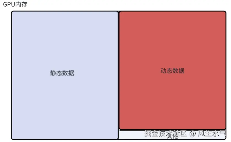 为了继续优化内存使用,首先需要了解运行时内存的分配情况。当实际运行的时候,内存中会包含三种类型的数据:静态数据、动态数据和其他数据。静态数据一般是模型的参数,这部分随模型加载而持续存放在内存中;动态数据则主要是跟随程序运行而逐步生成的动态数据,比如上面提到的kv cache;其他数据则是一些临时生成的数据。