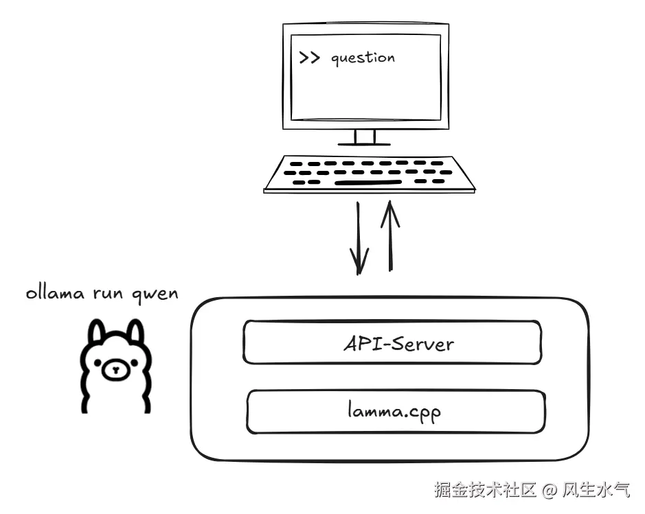 ollama本身是CS架构,用户通过ollama client和启动的server通信,server端主要由两部分构成,api server和lamma.cpp构成。其中api server提供对外的api服务,lamma.cpp负责实际的模型推导。