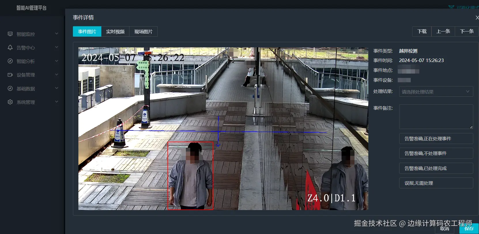 当检测到事件后,将立即触发告警并抓拍,并上报告警消息。告警消息可通过弹窗、提示音等方式进行提醒,便于管理人员及时查看。