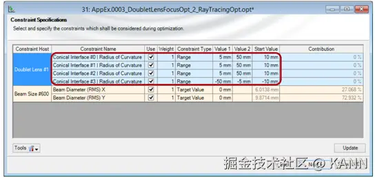 1. 系统详细内容 光源— 具有发散角的红外激光二极管 元件— 折射准直系统及具有双合透镜的聚焦系统 探测器— 点列图— 强度分布— 光束参数 建模/设计— 光线追迹:初始优化。— 场追迹:进一步降低点尺寸。 2. 系统说明 3. 建模与设计结果 光束参数的参数优化 4. 总结 对使用光线追迹所设计的透镜应用场追迹进行进一步优化,以提高透镜性能。第一步:利用光线追迹进行快速的预优化以获得合适的起始点以用于随后场追迹优化。第二步:将衍射效应考虑在内,应用场追迹进行精细化优化。 应用示例详细内容 系统参数 1. 应用实例的内容 该案例是一组相关示例中的一部分: BDS.0001,BDS.0002以及BDS.0003主要关于一个折射型光束传输系统 2. 设计任务 3. 参数:非准直入射激光束 4. 参数:准直透镜和后续光线 5. 参数:双合透镜 (*)来自肖特2014玻璃 应用示例详细内容 仿真&结果 1. 如何优化(预设置) 通过双合透镜的优化,使给定条件的准直入射光束聚焦在透镜后20mm处。 应用参数优化文件自动执行具有可变曲率半径的迭代仿真,直至获得最小的聚焦点。 由于整体设置的第一部分不变,我们直接将计算所得的光分布放在双合透镜前作为起始点。 为评价聚焦光斑,在目标焦平面处放置光束尺寸或光束参数探测器。 2. 光线追迹:预优化 光线追迹仿真具有速度快的优点。 因此,我们使用VirtualLab 中的光线追迹引擎进行第一步预优化。随后,利用经典场追迹引擎对结果进行细化。 3. 光线追迹:优化过程 通过光线追迹仿真,在142步优化过程中,VirtualLab变化4个表面的半径,并找到最小焦点直径。 4. 光线追迹:预优化后的聚焦表面 VirtualLab列出了参数以及优化的结果。在最有一列中显示了4个表面的曲率半径预优化结果。 ** **5. 光线追迹:3D评价 3D光线追迹系统分析器显示了预期的聚焦效果 **6. 光线追迹:聚焦点尺寸 ** 在光线追迹优化过程中,我们利用光束尺寸探测器评价光斑尺寸。 由此产生的光束直径在X和Y方向上的均方根有效值(指的是质心):2.27µm X 2.60µm(小于衍射极限)。 7. 改进:由光线追迹到场追迹 因为存在衍射效应,基于几何光学的仿真不能够对光实际的分布进行评价,。 在焦点区域内的情况 场追迹仿真可以考虑所有的波动光学效应。 因此,你可以利用场追迹仿真检查和改进你的光线追迹设计。 8. 场追迹:中间结果 因此,为了更有意义的结果,我们运行物理光学场追击仿真,考虑了衍射效应的同时,应用基于第二动量理论的光束参数探测器。 场追迹结果值“束腰距离X×Y”已表明,由于衍射效应,光线追迹优化的最佳的聚焦为值与预期的距离20mm不同。 因此,我们进行基于场追迹的第二步优化,并以预优化后的表面数据作为初始值。 9. 场追迹:最终优化 对于精细化优化步骤,不必改变所有表面。此处我们仅改变最后一个面,我们在20mm的距离得到最优焦点。 此外,这种微调通常仅仅进行微量的改变,因此我们为曲率半径的变化指定一个较小的范围。 10. 场追迹:最终结果 通过优化最有一个表面,我们改变束腰接近接近期望位置。因此,聚焦点尺寸进一步减小。 即使对于这个低数值孔径(NA),场追迹能够使我们改善最终聚焦点半径:0.12um×0.24um(1.4%×4.8%) 11. 结果补偿(第1步&第2步)&半径 在参数概览中显示了4个圆锥面的最终曲率半径,构成了双合透镜。 12. 总结 对使用光线追迹所设计的透镜应用场追迹进行进一步优化,以提高透镜性能。第一步:利用光线追迹进行快速的预优化以获得合适的起始点以用于随后场追迹优化。第二步:将衍射效应考虑在内,应用场追迹进行精细化优化。 13. 扩展阅读以下文件给出了如何在VirtualLab中设置和分析激光系统的更多细节 启动视频— 光路图介绍— 参数运行介绍 |