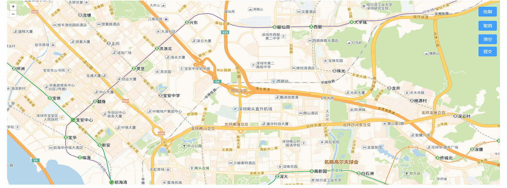 // 加载地图底图 const initMap = () => { // 创建一个地图 map.value = new Map({ // 存放地图的容器 target: "mapDiv", // 设置图层 layers: [ new TileLayer({ source: new XYZ({ url: "https://webrd04.is.autonavi.com/appmaptile?lang=zh_cn&size=1&scale=1&style=7&x={x}&y={y}&z={z}", }), }), ], // 设置视图 view: new View({ center: [113.937705, 22.56225], // 中心点坐标 zoom: 14, // 缩放等级 maxZoom: 18, minZoom: 6, projection: "EPSG:4326", // 经纬度坐标 }), }); };