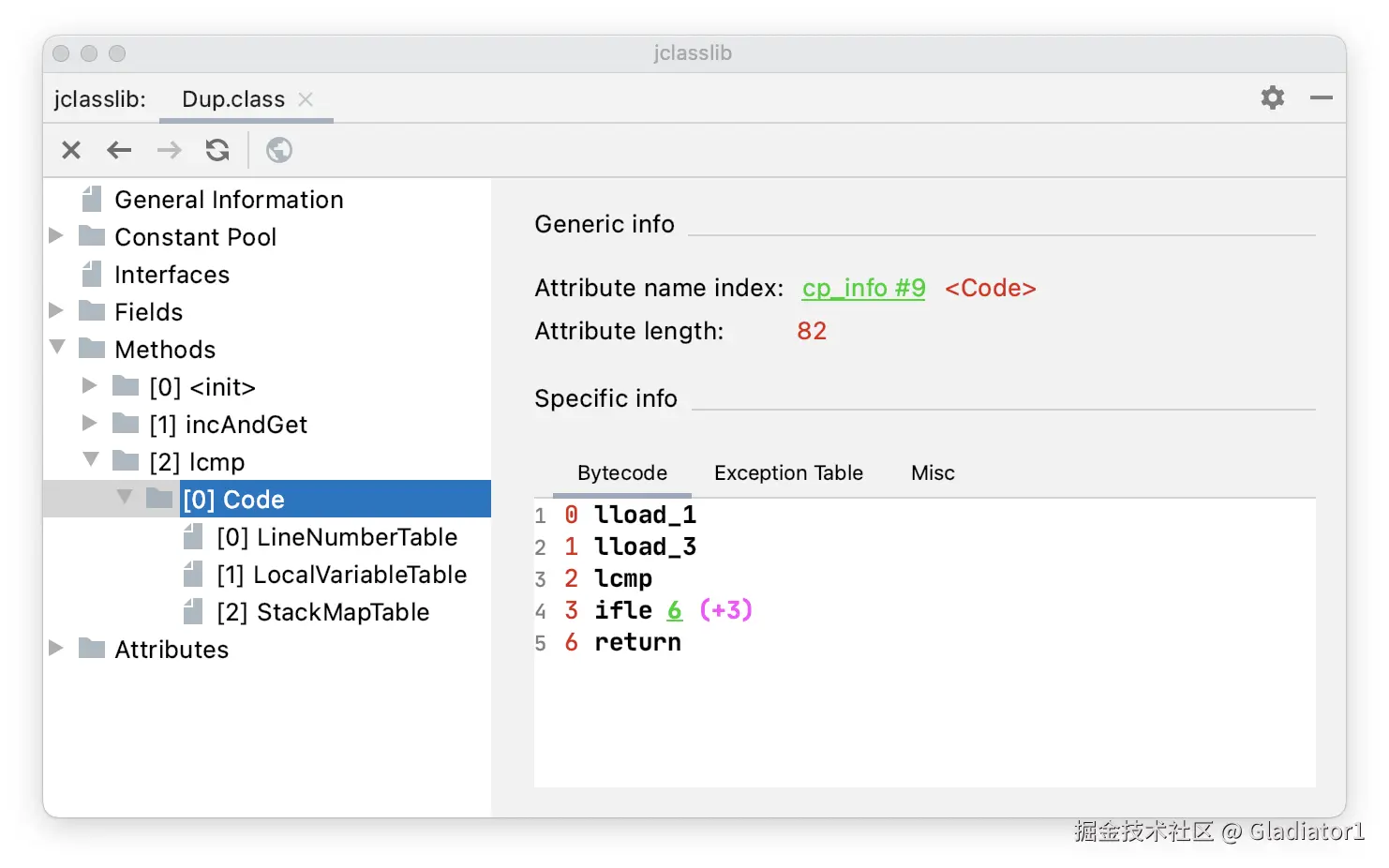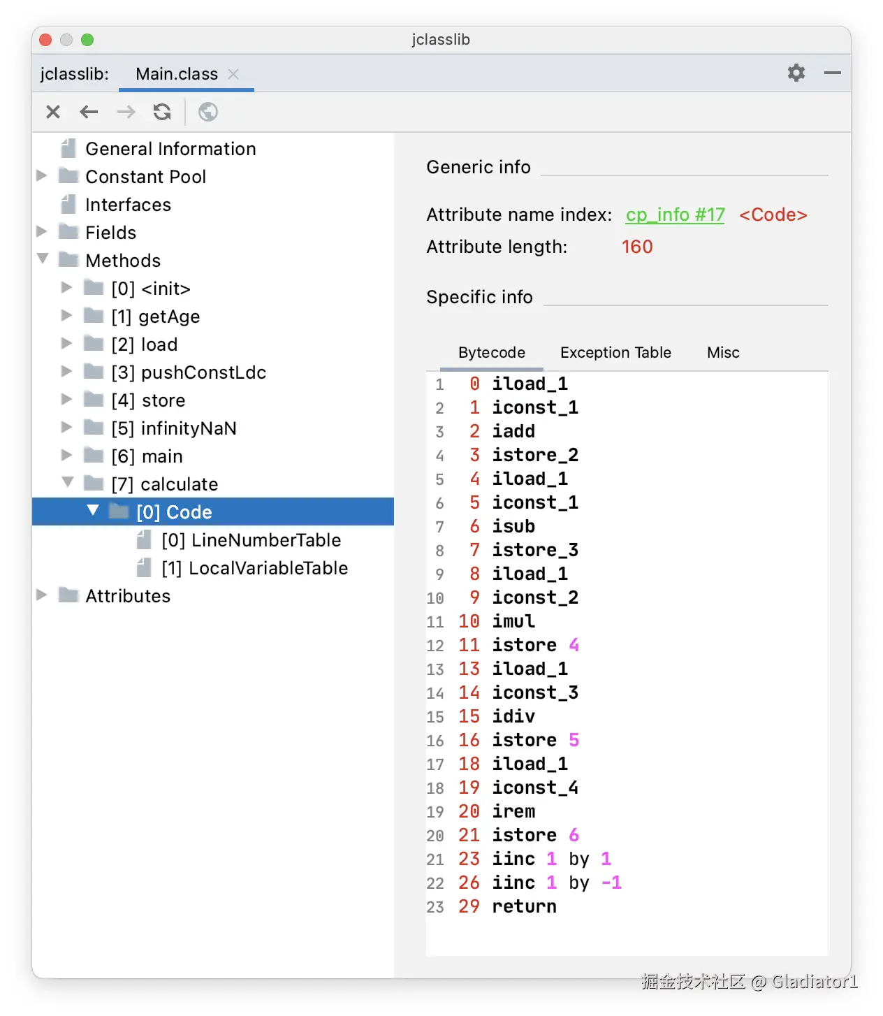 Exception table 这部分定义了异常处理器。在这个例子中,当在字节码偏移量 0 到 4 之间发生 ArithmeticException 时,控制跳转到偏移量 7,即 catch 块的开始。