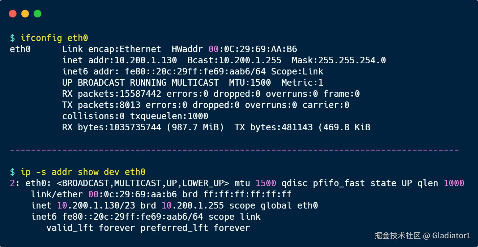 虽然这两个命令输出的格式不尽相同,但是输出的内容基本相同,比如都包含了 IP 地址、子网掩码、MAC 地址、网关地址、MTU 大小、网口的状态以及网络包收发的统计信息,下面就来说说这些信息,它们都与网络性能有一定的关系。