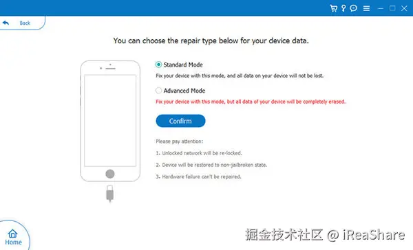 如果您尝试了所有可用的解决方案,但 iOS 更新暂停问题仍然存在,则问题可能与您的 iOS 有关。在这种情况下,请考虑使用iReaShare iOS System Recovery程序降级到 iOS 17 或更新到 iOS 18。此工具对于修复 iOS 系统问题非常可靠,可以修复 200 多个不同的问题,包括卡住的 iOS 18 更新。此外,它确保在修复过程中不会丢失任何数据。