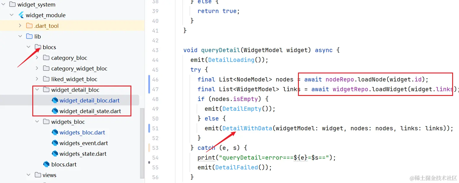 FlutterUnit 的 组件集录 功能实现,主要基于 bloc 进行状态管理。组件的展示信息由 widget_detail_bloc 维护,点击组件条目时触发 queryDetail 通过仓储查询数据,产出 DetailWithData 状态。其中记录着详情页中需要的数据: