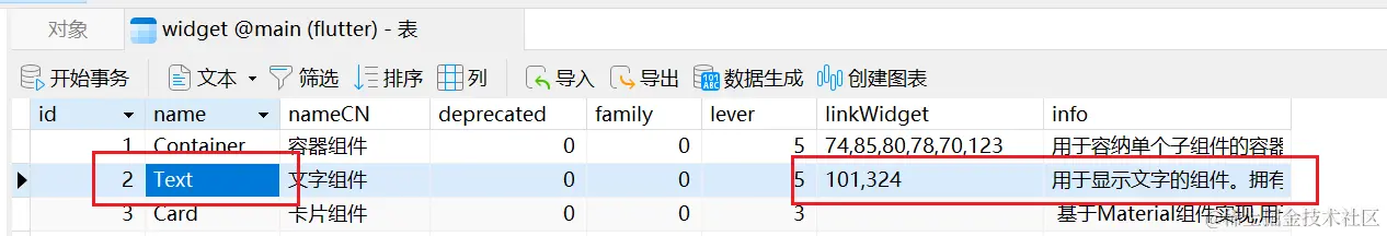 上一篇说过,FlutterUnitTool 会将每个组件中的 desc_zh-CN.json 解析并放入数据库。组件信息记录在 widget 表中: