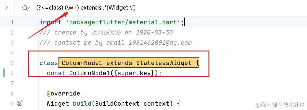 RegExp repClassName = RegExp(r'(?<=class) (\w+) extends .*(Widget \{)',multiLine: true);