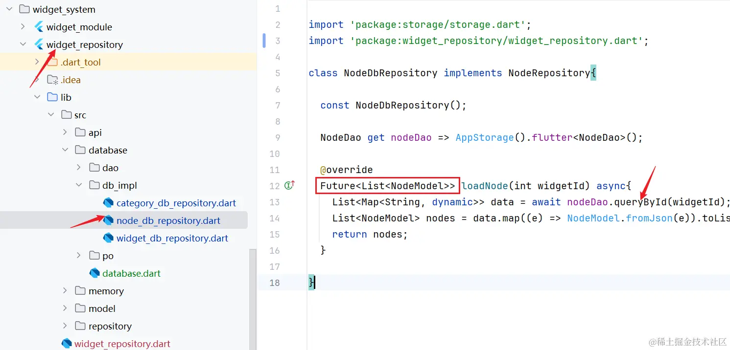 这样查询组件对应的展示节点,根据 widget_id 列表查询即可。应用程序中组件数据相关的处理放在 widget_repository ,表示数据仓储层。