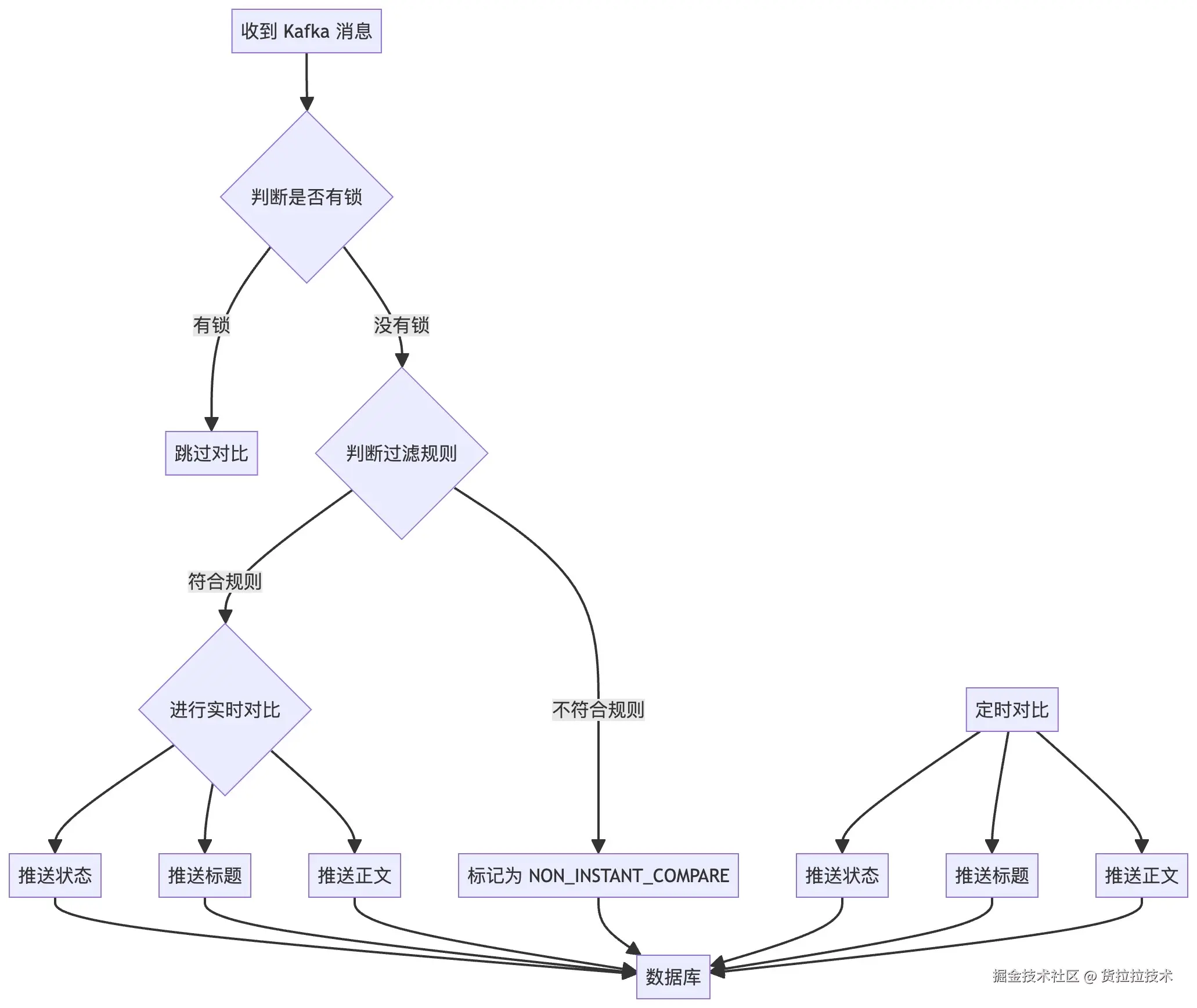 - 定时对比: 非实时对比的消息(即未通过过滤规则消息),一般在数据落库时,我们会把这条数据标记为需要定时对比。定时任务周期性扫表,对满足条件的数据进行对比。
