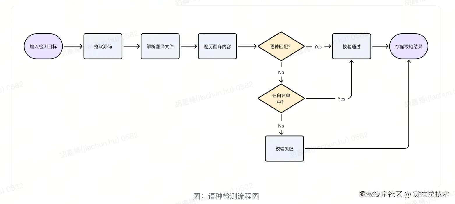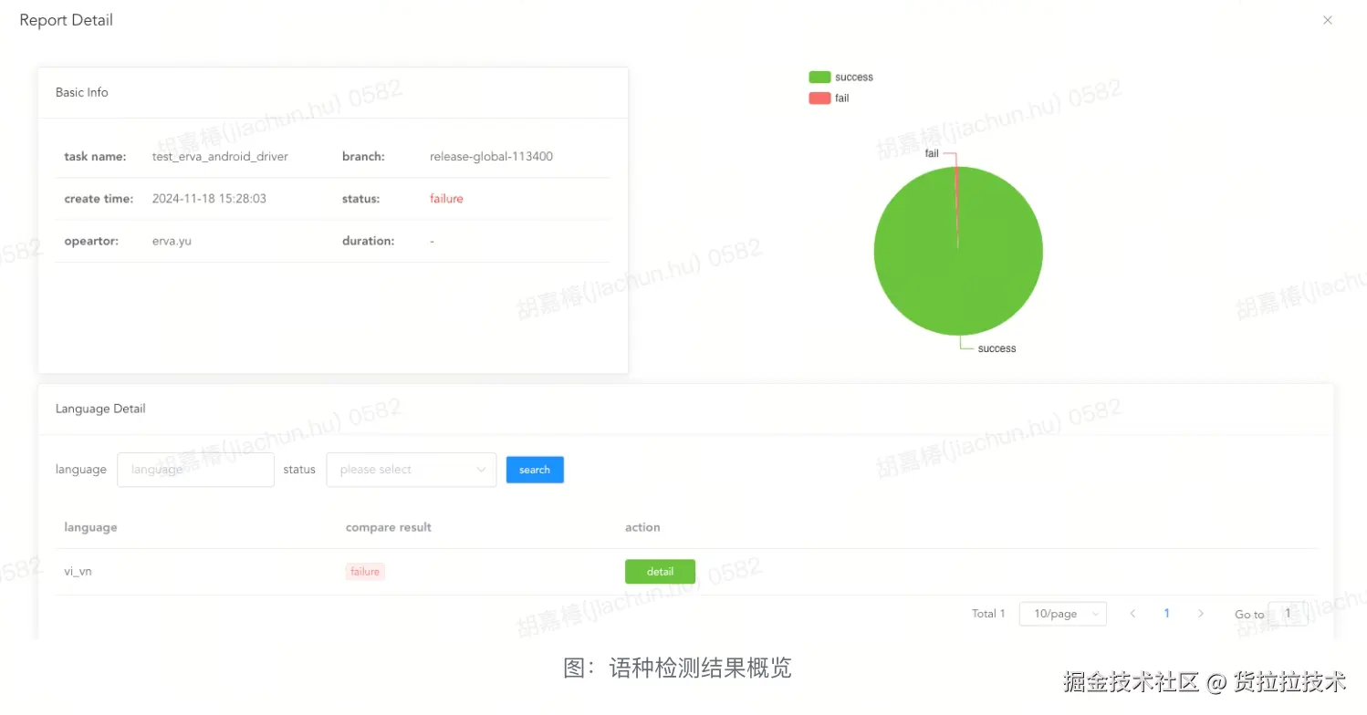 我们的自动化校验工具通过解析翻译原文件,获取翻译文本,然后对翻译文本进行全量校验,检查其语种是否符合预期,如果不匹配,检查是否是因为一些运营原因需要保持非本地语言的翻译,最终输出检查结果,落库存储,经由报告页面解析展示。