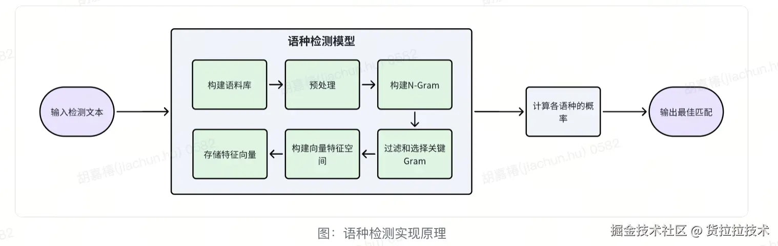 判断语种是否匹配时,使用基于N-Gram的语种检测模型,其实现原理如下: