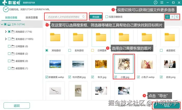 步骤2: 等待软件的扫描结束后,选择自己需要恢复的照片后,点击“导出”;