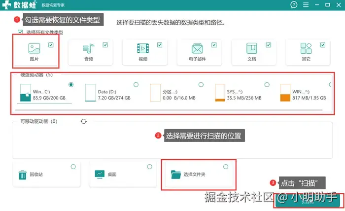 步骤1: 打开软件,在首页选择自己需要恢复的文件类型(点击“图片”)和扫描位置,点击“扫描”;