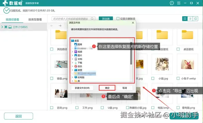 步骤3: 点击“导出”后会出现“浏览文件夹”,在上面选择恢复照片的新存储位置。