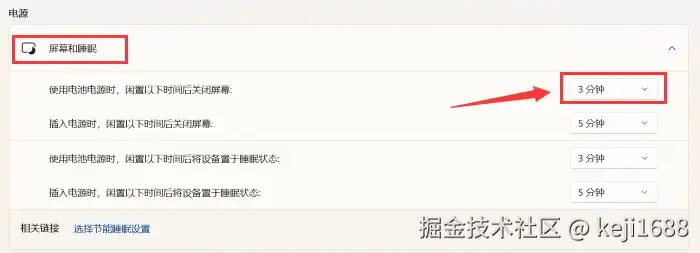 步骤2:在 【屏幕超时】 设置中,您可以自由设置 【电源和睡眠】 的时间,以控制无操作后屏幕关闭和电脑进入睡眠模式的时间。