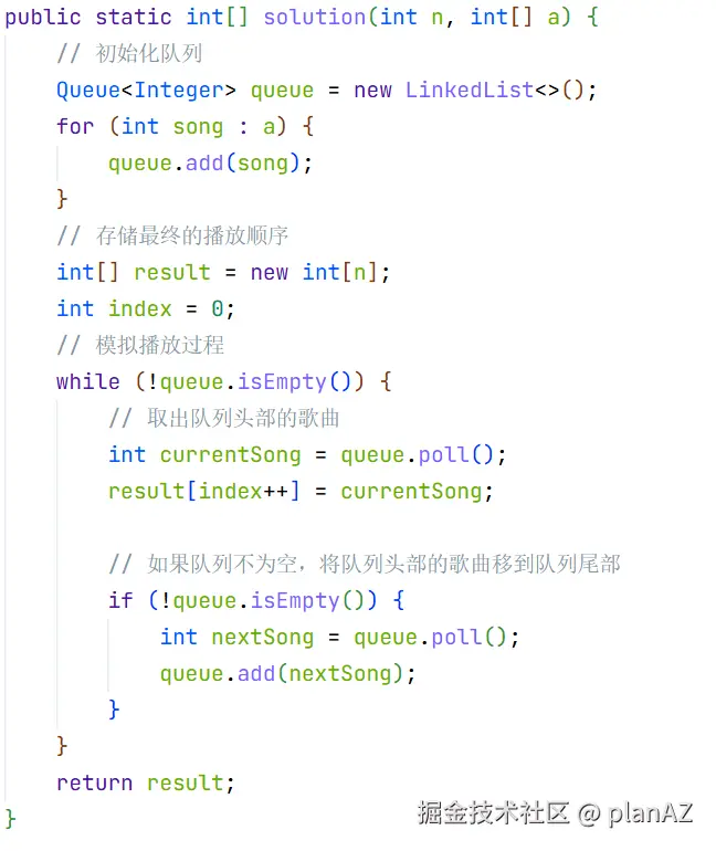 我们可以使用一个队列(Queue)来模拟歌单的操作。队列的特点是先进先出(FIFO),非常适合用来处理这种需要按顺序移除和移动元素的问题。