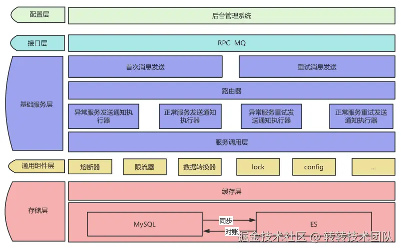 缓存层与持久化层,缓存层主要是缓存配置的发送策略、重试策略以及其他一些需要进行缓存的内容,持久化层主要是ES与MySQL,MySQL存储消息的发送记录以及配置,ES主要存储消息的发送记录供用户查询。