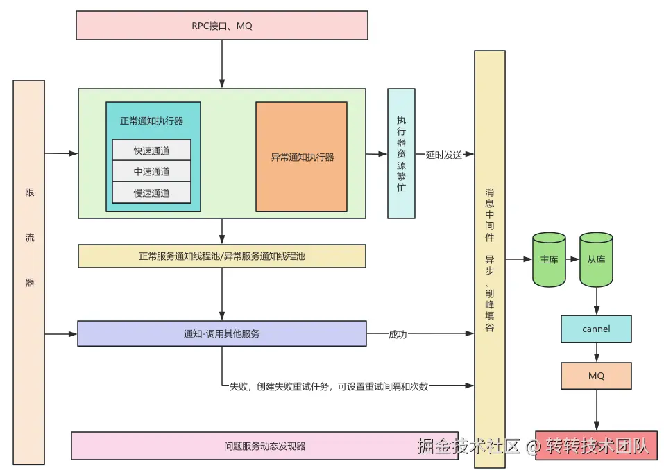 在接受消息发送请求的时候,一般会通过 RPC 服务请求和 MQ 消息消费进行处理,这两种方式各有优缺点,RPC 这种方式,我们无需考虑消息的丢失问题,MQ 可以实现异步解耦、削峰填谷。