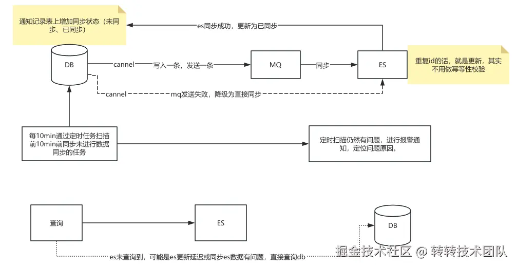 由于发送消息的数据量,后台在进行数据查询时主要是通过ES进行查询处理的,这就涉及到数据库数据与ES数据一致性的问题。当然也可以采用分库分表或宽表等技术进行处理,分库分表对一些非分片键的查询可能不太友好。