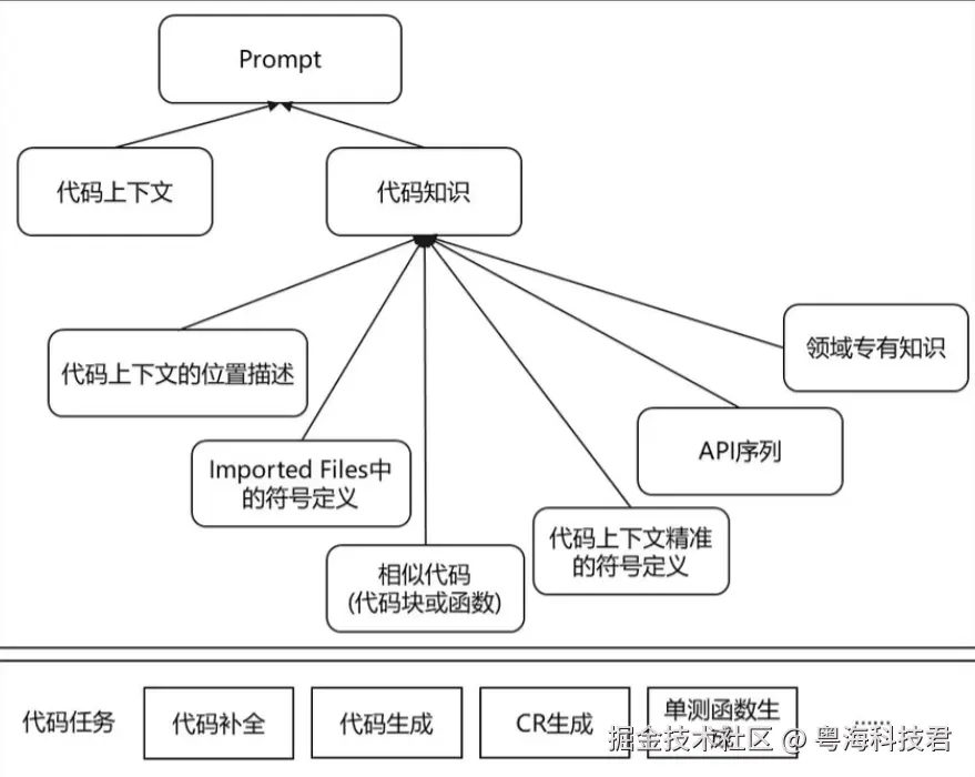 代码任务的 Prompt 包含代码上下文和代码知识 2 大部分,其中代码上下文根据不同的代码任务有一些差异,针对代码补全、代码生成任务,代码上下文是当前光标位置处上下文的代码;针对 CR 生成任务,代码上下文是 Diff 片段的上下文代码;针对测试函数生成任务,代码上下文是原始的测试函数。