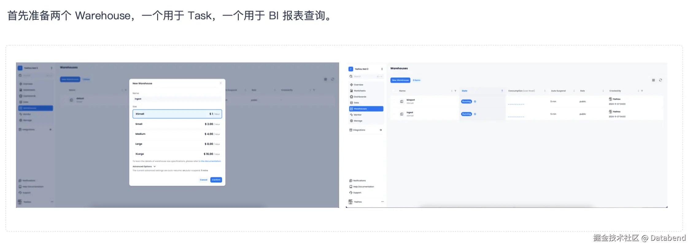 用户所需要的准备工作非常简单。首先,准备两个 Warehouse,一个用于 Task 摄入数据,一个用于 BI 报表查询。一般来说,摄入数据的时候可以用一个规格小点的 Warehouse,查询的 Warehouse 规格高一点,因为查询不会一直查,可以节省更多成本。
