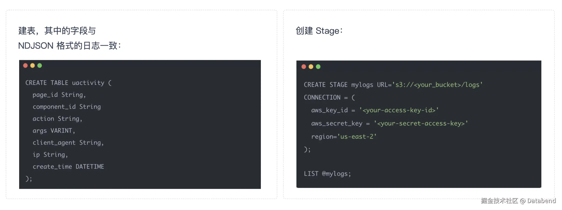 数据摄入与处理:在 Databend Cloud 中创建一个 copy task 任务,自动把日志拉出来,落到 S3。很多时候,S3 在 Databend Cloud 中可以当做一个 stage,落到 stage 里面的东西就可以被 Databend Cloud 自动吸进来,然后在 Databend Cloud 中进行处理,再从 S3 转出去。
