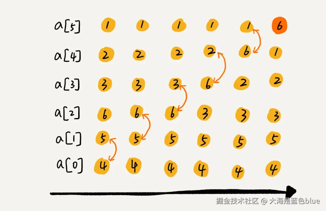 每冒泡一次就可以确认一个元素的最终位置!所以要想完成所有元素的位置,我们只需要重复六次,就可以完成冒泡排序
