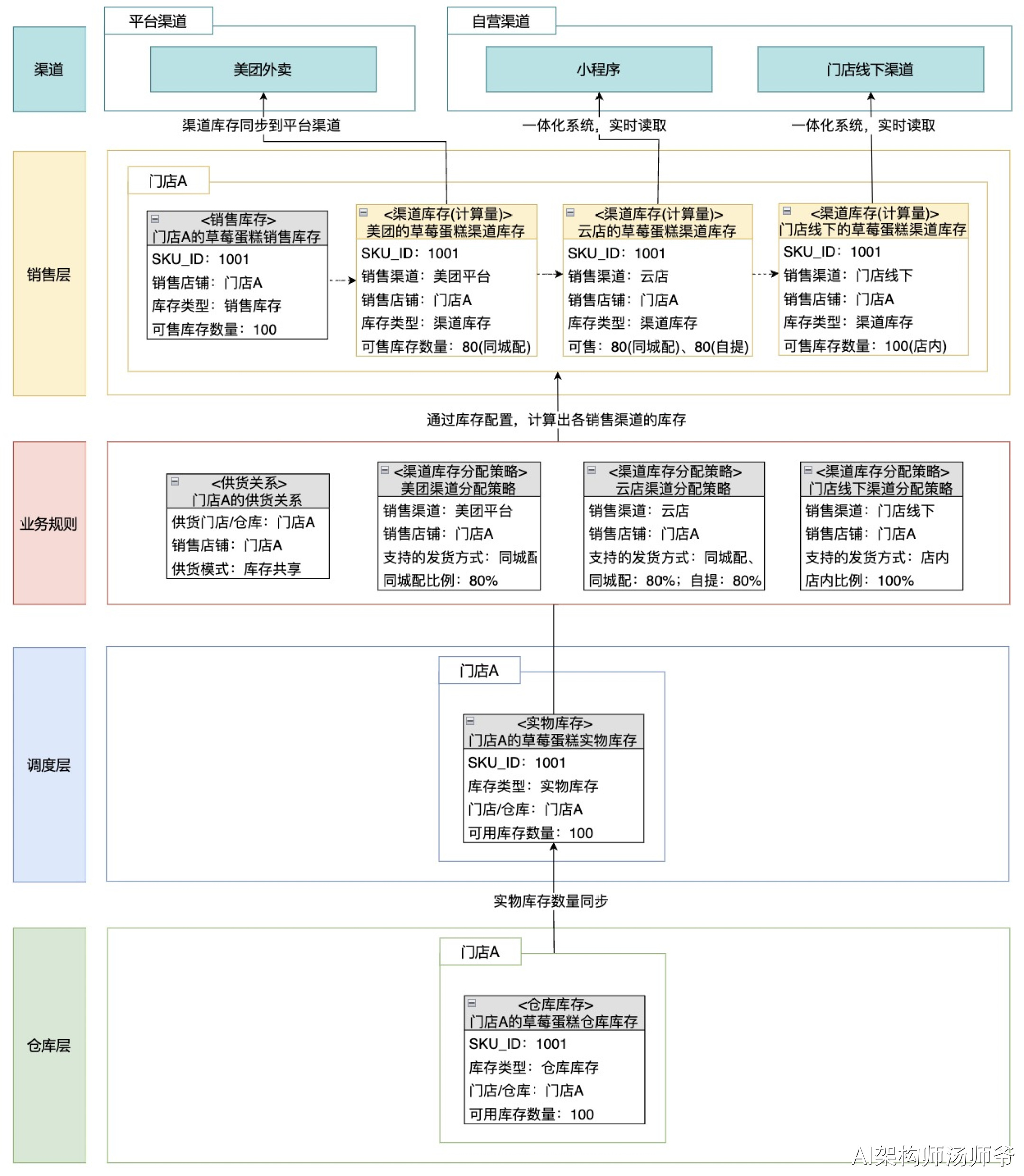 门店A持有 100 份草莓蛋糕,通过全渠道库存共享模式,将库存整合为“一盘货”,同时在美团外卖、小程序、门店线下渠道进行售卖。