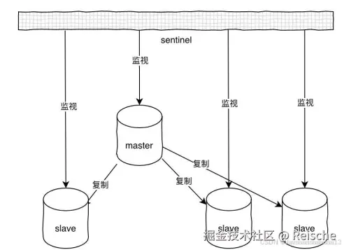 哨兵可以同时监视多个主从服务器,并且在被监视的master下线时,⾃动将某个slave提升为master,然后由新的master继续接收命令。整个过程如下: