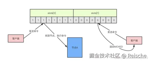 当客户端向节点发送命令,如果刚好找到slot属于当前节点,那么节点就执⾏命令,反之,则会返回⼀个MOVED命令到客户端指引客户端转向正确的节点。(MOVED过程是⾃动的)