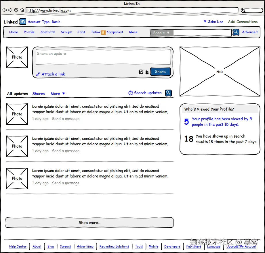 8、LinkedIn 线框图LinkedIn 是全球最大的职业社交平台,其线框图的在个人资料页面的线框图设计上,LinkedIn 展示了用户的基本信息、工作经历、教育背景、技能证书等内容,每个部分都有明确的分类和展示方式,用户能够方便地编辑和查看自己的个人资料。此外,LinkedIn 的线框图还展示了一些职业发展相关的功能,如职位推荐、小组、inbox等,这些功能的集成使得 LinkedIn 成为了一个职业发展的综合性平台。
