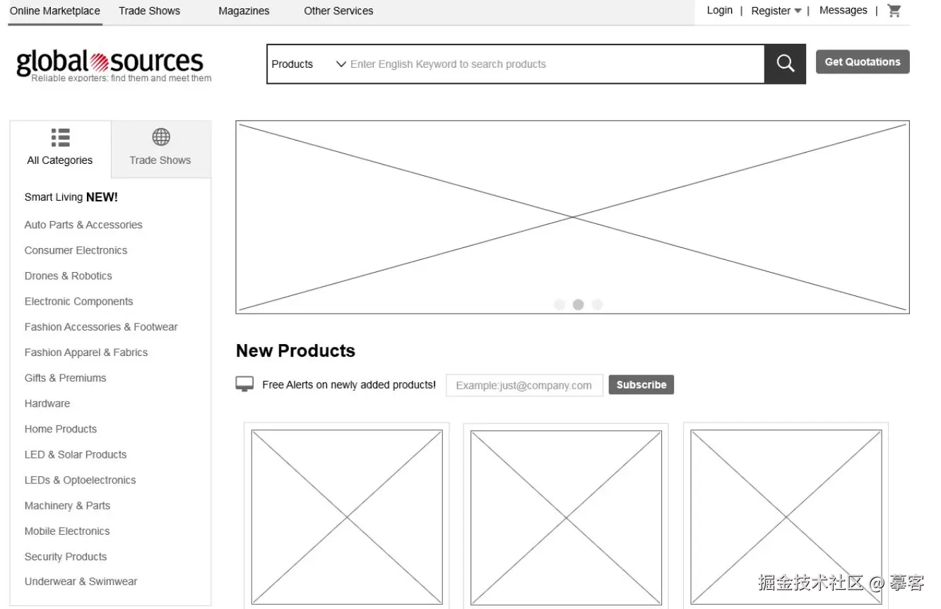 Global sources面向全球的专业展览主办机构,它展示了一个典型的网站网页线框示例。网站线框图包括首页、分类、消息和登录页面等。产品可以在产品页面的中心区域轻松展示,并在描述输入中加载详细信息。Global sources的功能设置使导航灵活,让用户使用更方便。
