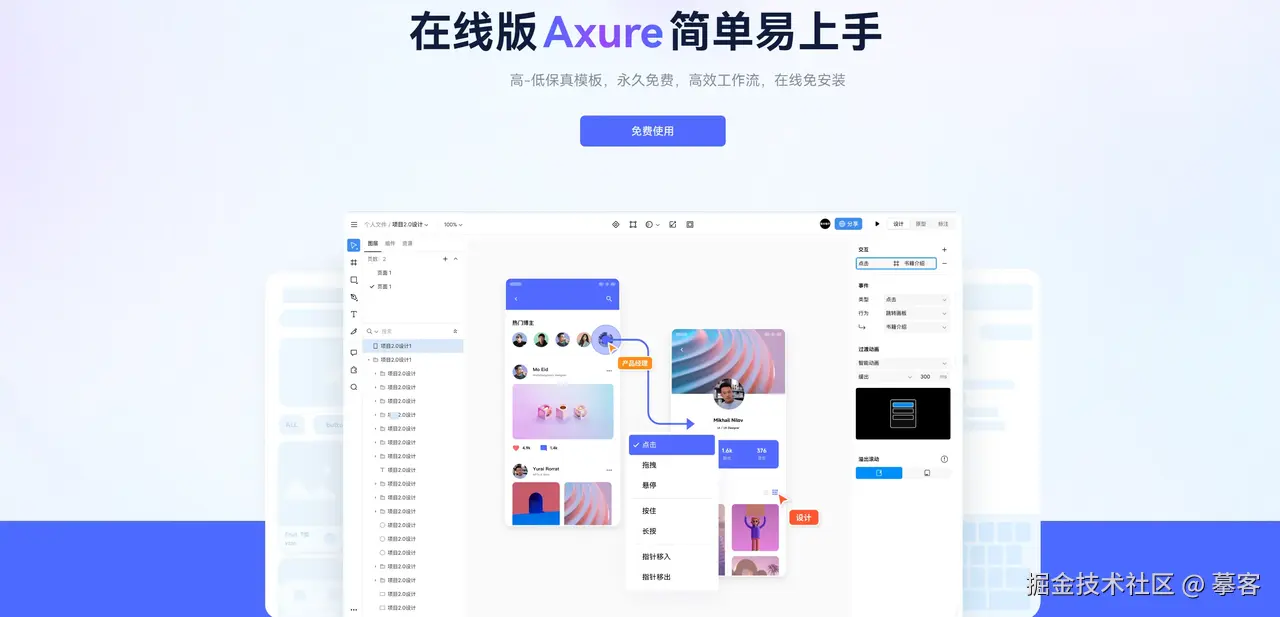 摹客RP是一款专业的快速原型设计工具,支持多人协作、高保真交互设计等功能。它可以帮助设计师快速创建线框图、原型和高保真设计,提高设计效率。